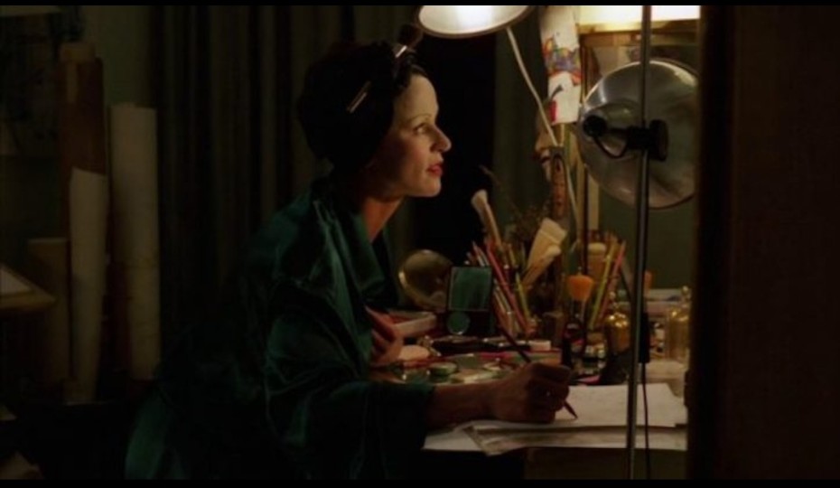 化妆台/化装镜前的静默很容易被顺便化作近景与局部的私人声响,有一处室内戏把视线限制在化妆台的镜面与台面物件上。画面用中密度的构图把人物与日常物件并置:镜子里是人物的侧脸,镜前散落着刷子、碎布、未干的颜料或口红,台灯的光在物件上形成一连串小型明暗岛。摄影机多用平视或略高于肩的角度,这样观众既看见被照的人,也能看到桌面上的微粒细节。声音线索偏向局域化的日常物:刷毛摩擦玻璃的刺耳音、指甲在镜框上轻敲、纸张被翻动的薄响,配乐在这段进入了带有主题名字的小曲(唱片曲目表中能找到以女性名字命名的主题,用较为温婉的弦乐与单簧管或竖琴装饰),配器在这里被压缩为单声部的旋律加上淡淡的回声。功能上,这段音乐通过一个可辨识的主题把人物的私人空间标记出来,使得随后任何历史或幻视进入这片空间时都被映射到那个主题之上,从而让“现在的身体感受”与“历史的回响”在同一主题脉络下发生——如同枯卷边角贴着一小段祷词。