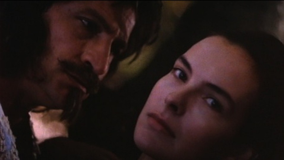 1.在卡尔施密特电影中常见的近身对峙场景里——可见男子脸切近女子,她的脸在镜头中仍保持著一种半睡的冷静,男子侧脸的胡渣、鼻樑与阴影在画面左侧挤压出强烈的性张力;光线在两人之间流动,像是用刀片切开了空气,并在那一条极窄的界面上产生振动。这一幕像是整片电影的核心:爱慾与暴力、保护与侵入,在皮肤上并置而不被立即判定。